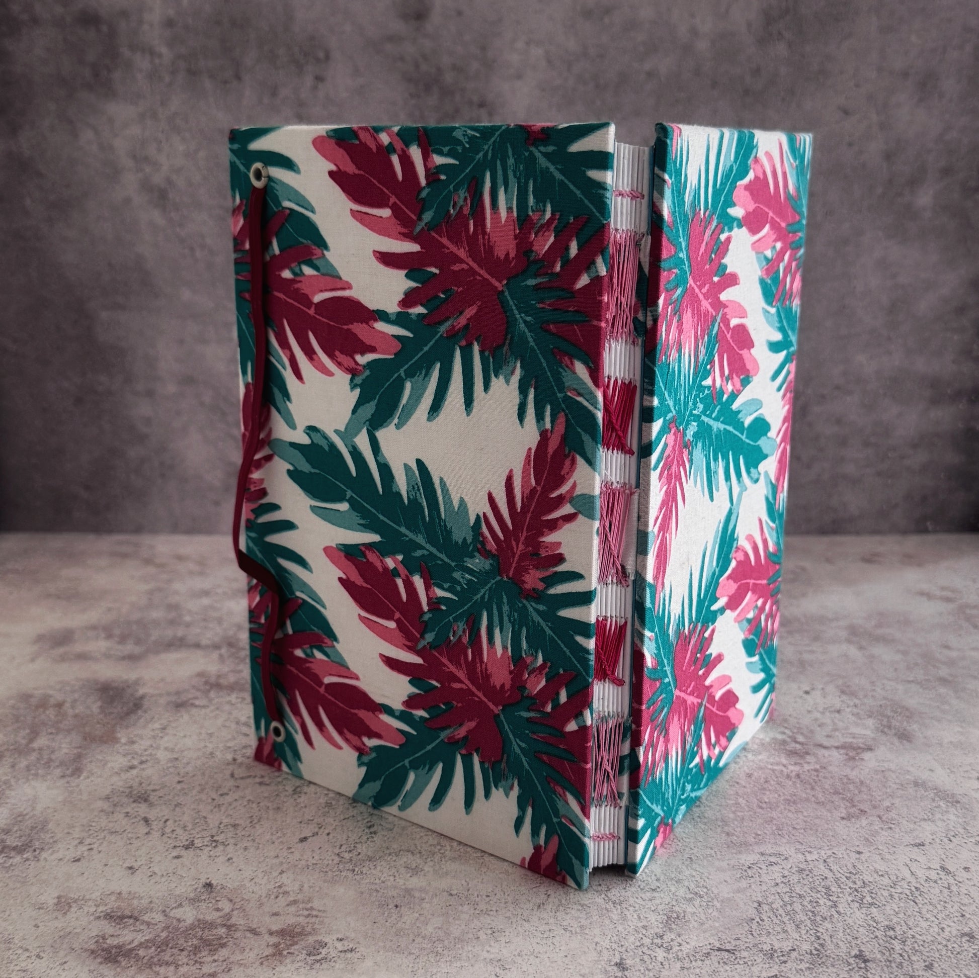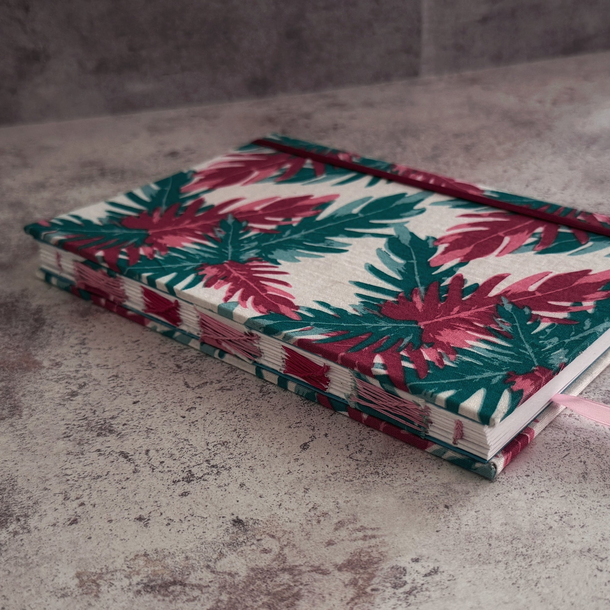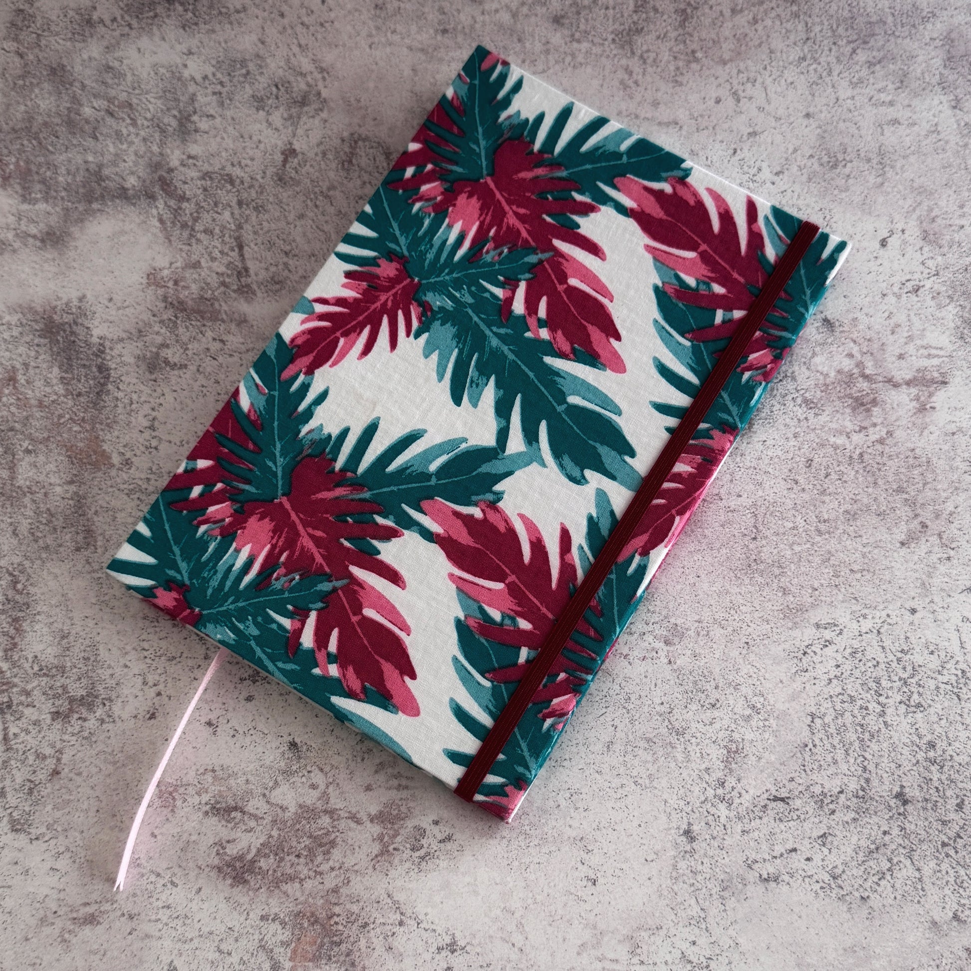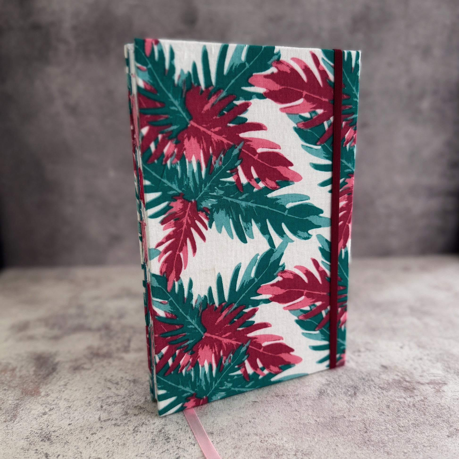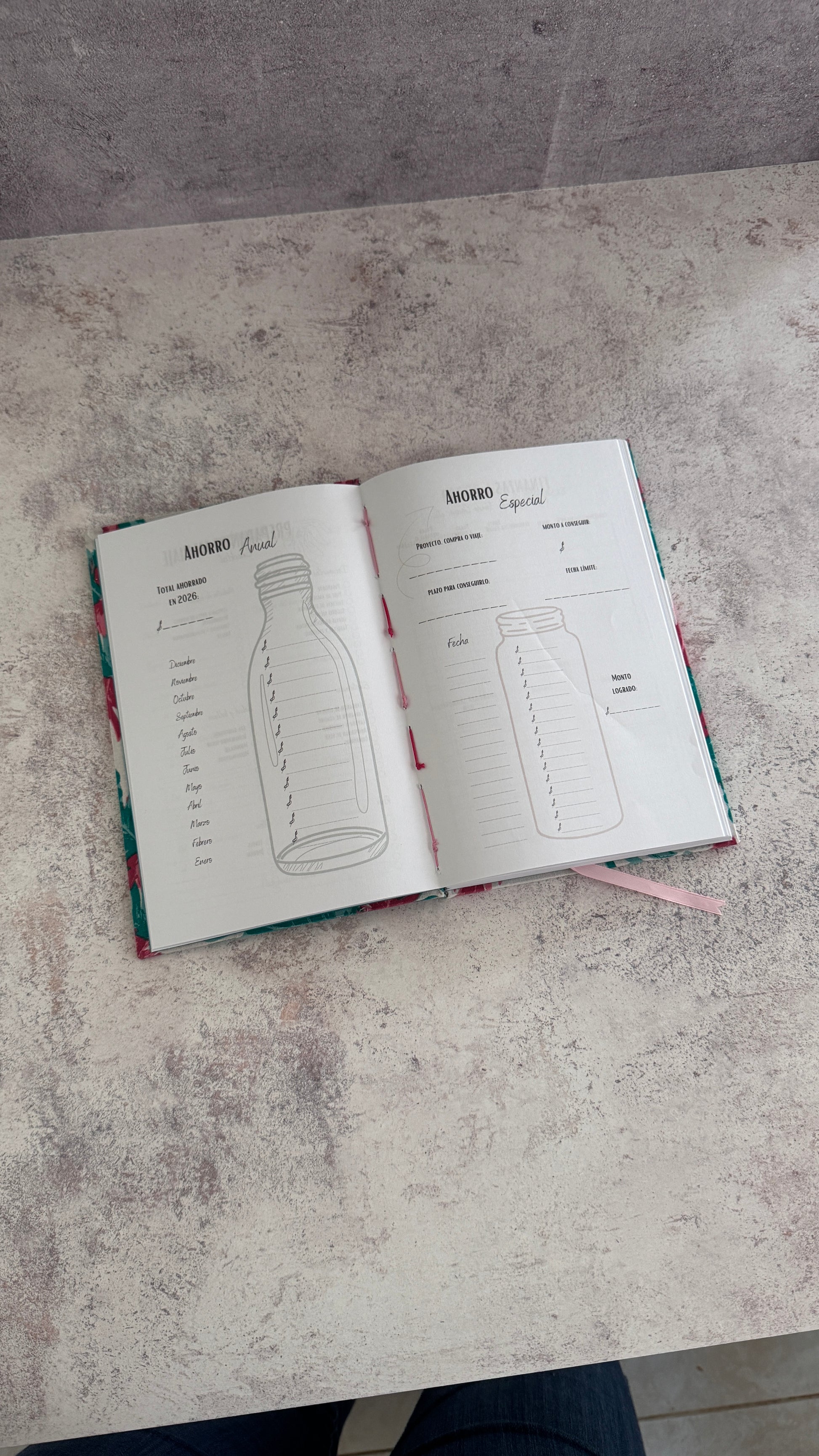 Agenda con vista semanal. Espacios para organizar finanzas, citas médicas, control de hábitos, lista de series o libros por leer. Tamaño media carta, forrada con tela de algodón estampada y encuadernado con costura francesa expuesta.