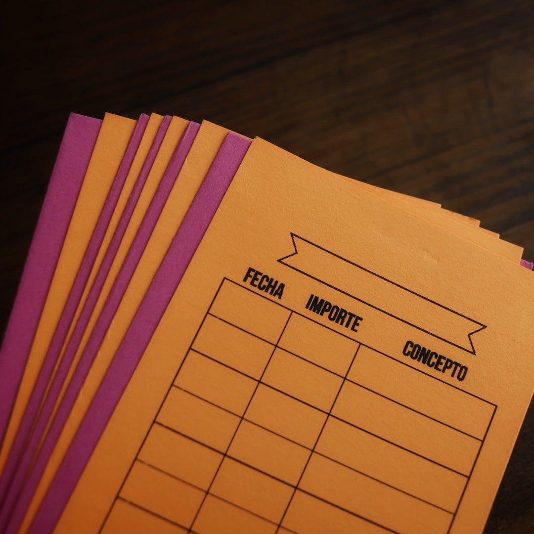 Organigastos con 5 sobres de billetes color rosa y tarjetas naranjas. Tiene pasta dura y argolla suelta de metal.