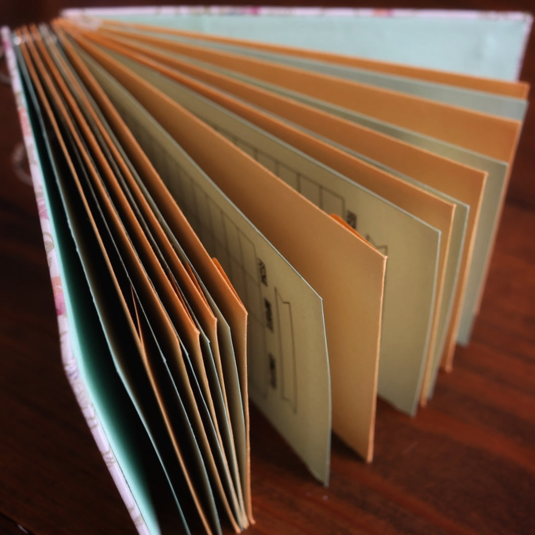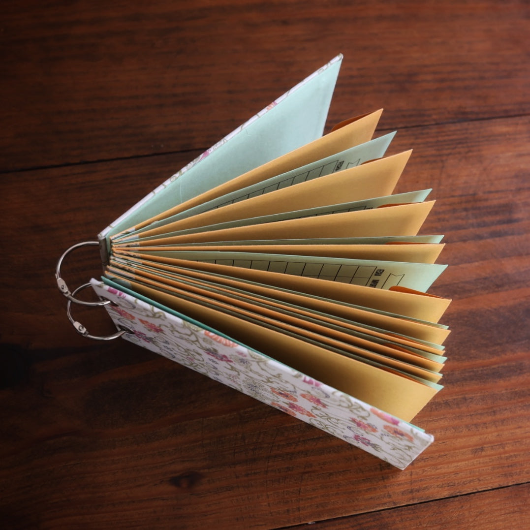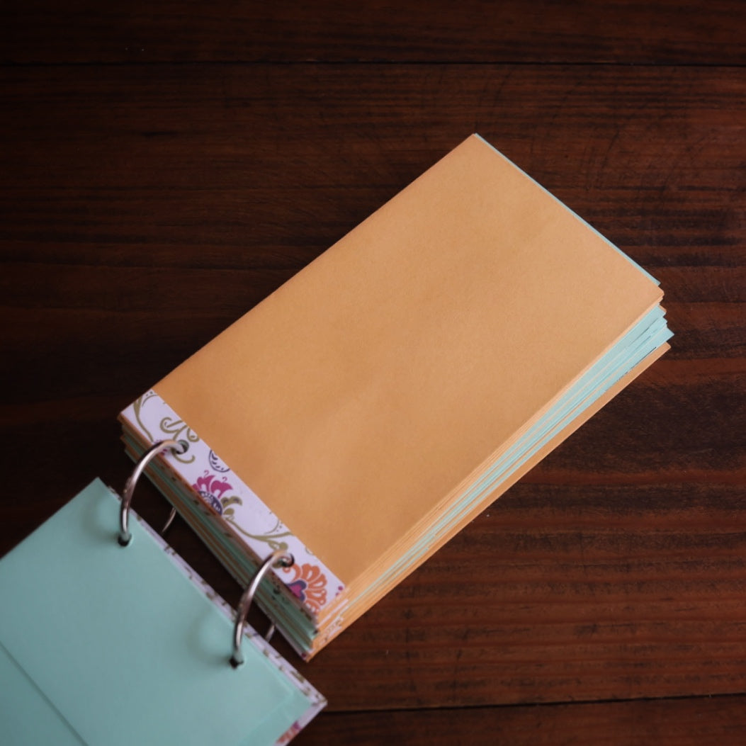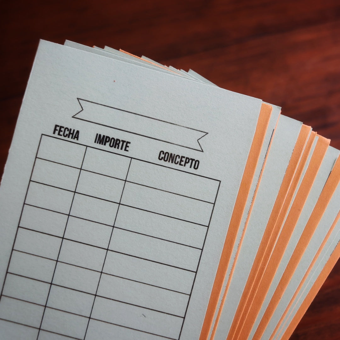Organigastos con 10 sobres color naranja y etiquetas para apuntes de color verde. Pasta dura y argolla suelta que permite sacar y poner nuevos sobres.