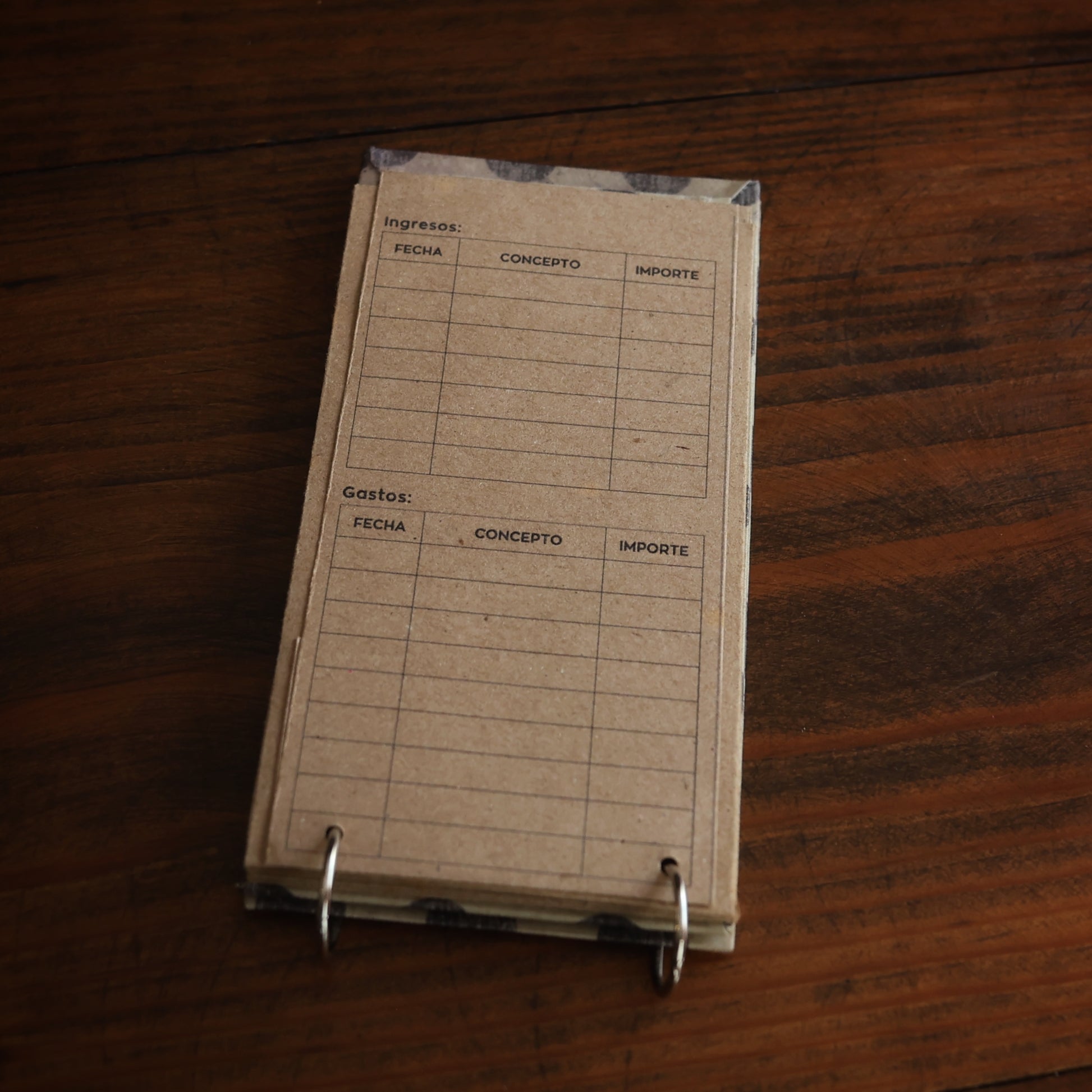 Organigastos con 5 sobres de billetes color Kraft. Tiene pasta dura y argolla suelta de metal.