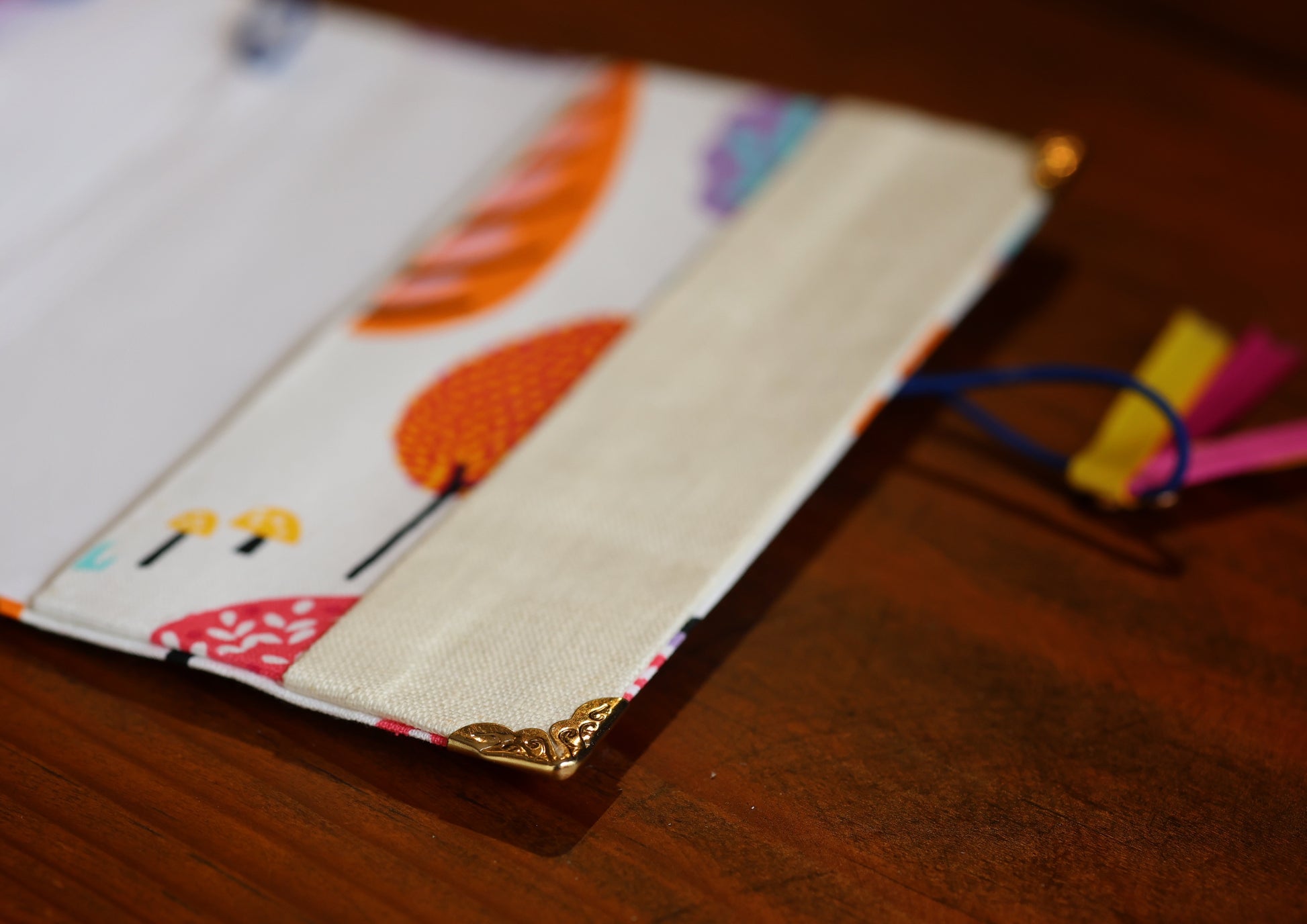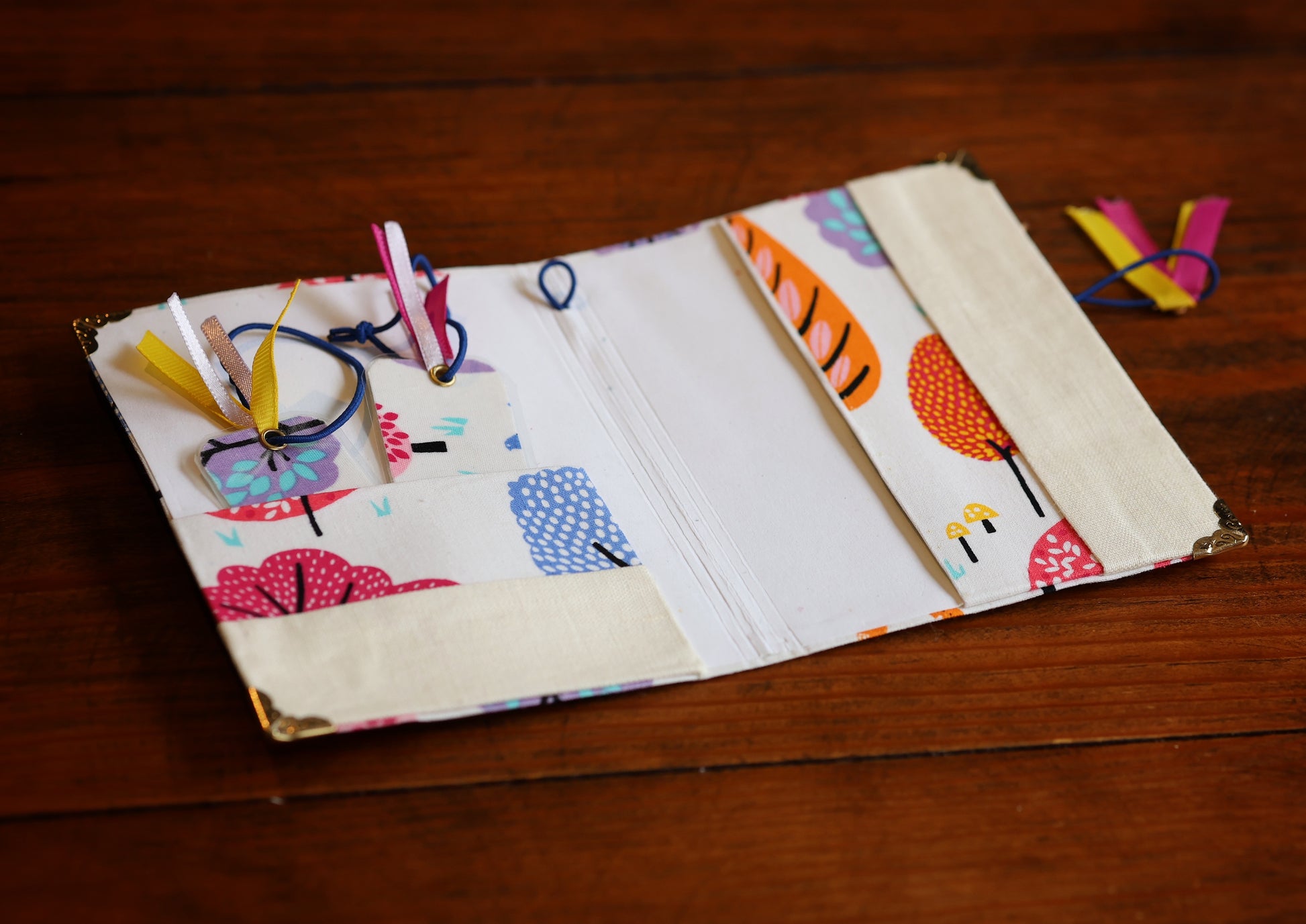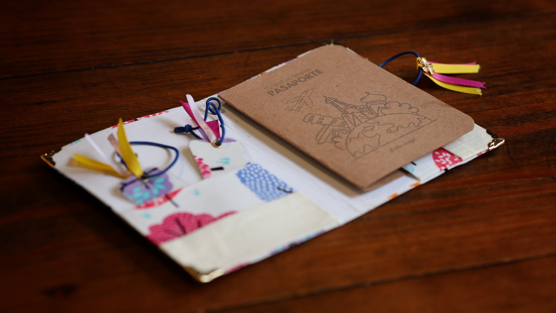 Porta pasaporte de pasta suave, forrado con tela de algodón. Esquinas protegidas con esquineros de metal. Cierre con elástico. Incluye identificadores para maletas. Hecho a mano.